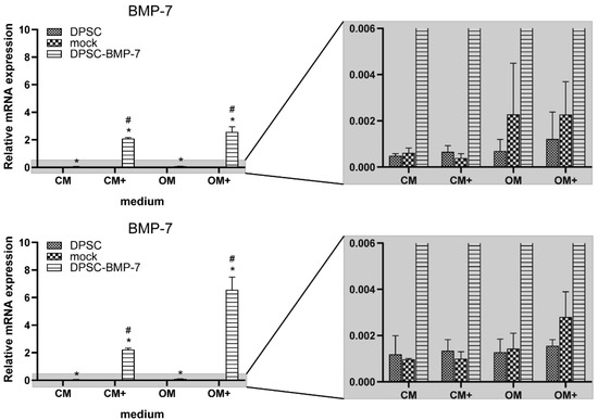 The expression level of BMP-7 mRNA in the case of the indicated cell lines. After 1 week (above) and 3 weeks (below) of induction in different media (mean ± SD; n = 3). *, p ˂ 0.05 vs. control in the same media, #, p ˂ 0.05 vs. untreated (CM or OM respectively) group of the same cell line.