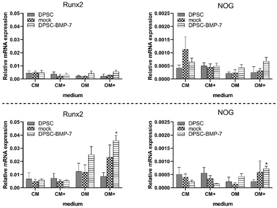 Expression level of Runx2 and noggin (NOG) mRNA in case of the indicated cell lines. After 1 week (above) and 3 weeks (below) of induction in different media (mean ± SD; n = 3). *, p ˂ 0.05 vs. control (DPSC) in the same media, #, p ˂ 0.05 vs. untreated (CM or OM respectively) group of the same cell line.