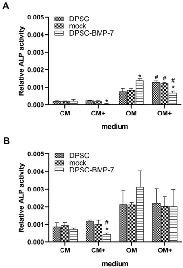 ALP activity of the indicated cell lines. After 1 week (A) and 3 weeks (B) of induction in different media. *, p ˂ 0.05 vs. control (DPSC) in the same media, #, p ˂ 0.05 vs. untreated (CM or OM respectively) group of the same cell line.
