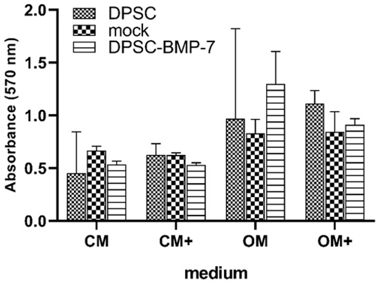 After 21 days, most of the alterations observed earlier were restored, only the DPSC-BMP-7 in CM+ showed a reduction in its ALP activity (Figure 4B) compared to that of the control and the activity measured in CM.
