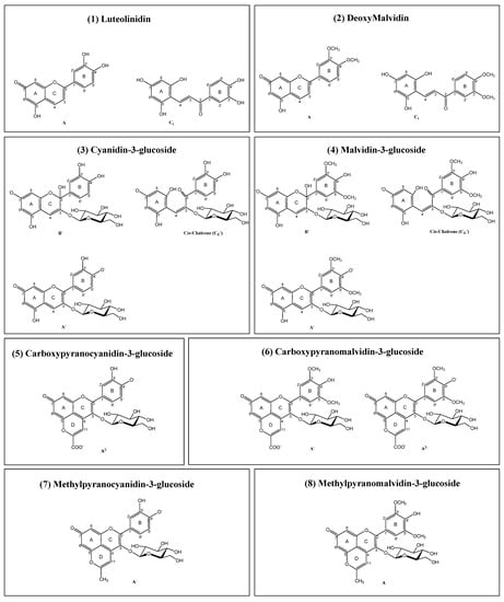 Four 3-O-glycosilated pyranoanthocyanins were hemi-synthesized: carboxypyranoanthocyanins (compounds 5 and 6) and methylpyranoanthocyanins (compounds 7 and 8) [].