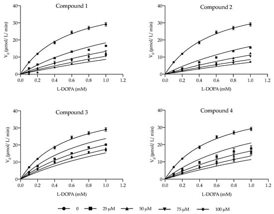 Generally, the mode of inhibition of the so called “true inhibitors” fits into one of these four types of reversible inhibition: competitive (the inhibitor can bind to the free enzyme, competing with the substrate for the same binding site in the active site of the enzyme), uncompetitive (the inhibitor only binds to the enzyme-substrate complex), mixed type (combines both competitive and uncompetitive behavior), and noncompetitive (the inhibitor binds to the free enzyme and an enzyme–substrate complex with the same equilibrium constant) []. GraphPad Prism 8.2.1 was used to fit the experimental data to these four models, all of them compared with each other. Akaike’s Information Criteria (AICc) approach was used to compare the fit of competitive, uncompetitive, and noncompetitive models, while extra sum-of-squares F test was used to compare the mixed model with the remaining three models, as they are considered to be special cases of the mixed model general equation. The model fitting results consistently suggest that the four compounds exert their inhibitory effect on the diphenolase activity of tyrosinase through a competitive mechanism. Graphical representations of the enzymatic kinetics are exhibited in Figure 2.