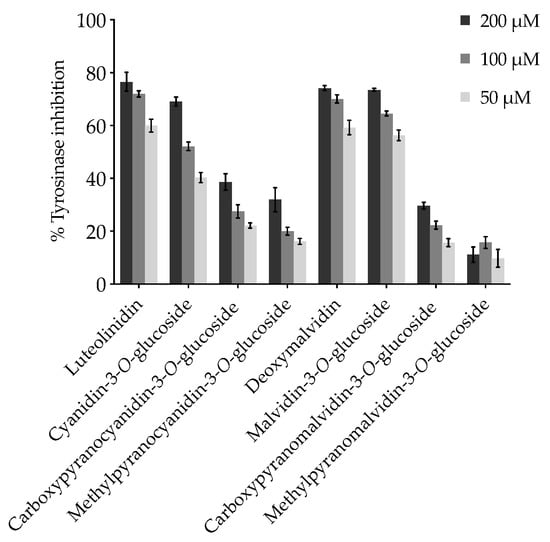 Inhibition measurements at increasing compound concentrations evidenced that the eight compounds prevent L-DOPA oxidation in a dose-dependent manner (Figure 3), and the IC50 values, calculated by non-linear regression analysis, confirmed the potency of luteolinidin and deoxymalvidin as inhibitors, corroborated by their lower inhibition constants, ki, (Table 2), suggesting a tighter binding of these compounds. On the other hand, their glycosylated analogues, cyanidin- and malvidin-3-O-glucosides, exhibited a weaker inhibitory effect given their both higher IC50 and ki values, particularly in the case of cyanidin-3-O-glucoside (IC50 = 77.91 μM). Nevertheless, the four compounds considerably inhibited the activity of tyrosinase at 200 μM. Despite the less pronounced effect denoted by pyranoanthocyanins, with carboxypyranocyanidin-3-O-glucoside exhibiting the highest inhibition rate (nearly 40% at the concentration of 200 μM) (Figure 3), their greater stability compared with the parent compounds should be highlighted. The protective effect of the additional pyranic ring against the nucleophilic attack of water restricts the formation of hemiketals under weakly acidic to neutral environments, ensuring the stabilization of the color intensity [], which might represent a beneficial feature considering the potential application of these compounds.