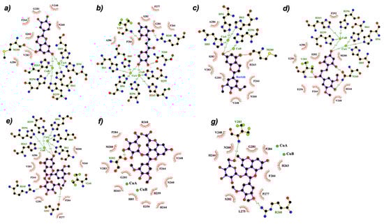 2D representation of the best docking pose of some representative compounds towards the active site of mTYR: (a) 1-A, (b) 1-Ct, (c) 2-A, (d) 2-Ct, (e) 4-B−, (f) 6, and (g) 8. LigPlot was used for diagram rendering []. The 3D poses are depicted in Figure S2.