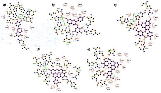 2D representation of the best docking pose of some representative compounds towards the active site of hTYRP1: (a) 1-A, (b) 3-B−, (c) 5, (d) 7, and (e) 8. LigPlot was used for diagram rendering []. The 3D poses arthe active sie depicted in Figure S3.