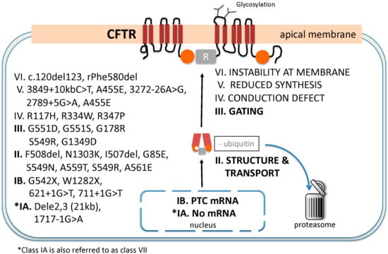 Classification of the CFTR disease-causing mutations. Classes I–III comprise most of the mutations associated with classical CF disease. Examples of alleles of each class are listed for each mutation class. * Class 1A is often referred to as class VII as originally suggested by De Boeck and Amaral [].
