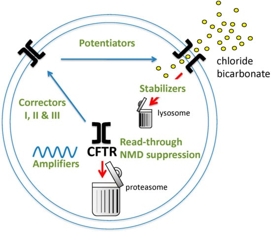 Promising strategies to correct the function of the abnormal CFTR protein resulting from different mutations are summarized in Figure 3. Classes of CFTR modulating agents include potentiators, correctors, amplifiers, read-through agents, NMD suppressors and stabilizers.