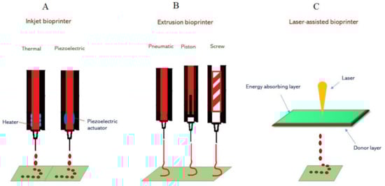 A representation of methods for 3D printing by inkjet, micro-extrusion, and laser-assisted bioprinters. (A) Inkjet printing (thermal and piezoelectric). In thermal inkjet printers, a heater creates air-pressure pulses resulting in the generation of droplets on the print. For piezoelectric inkjet printing, a mechanical pulse is generated by an actuator that forces the bio-ink droplets from the nozzle. (B) In 3D printing by micro-extrusion, three dispensing systems (pneumatic, piston-driven, and screw-driven robotics) are used to produce a continuous stream of hydrogel containing cells. (C) In laser-assisted bioprinting, laser energy induces bubble nucleation and forces droplets of bio-ink towards the substrate.