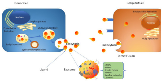 Schematic representation of exosome generation, secretion, and cargo transfer from the donor cells to the recipient cells.