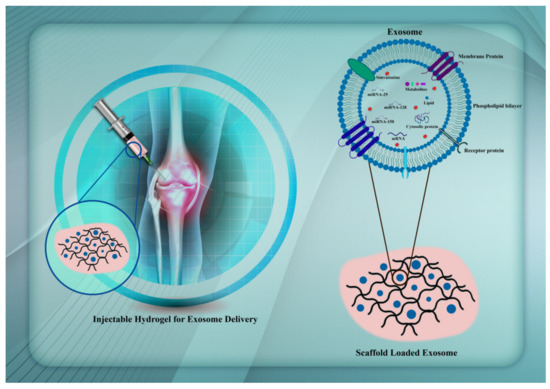 Exosomes are released by various cells, including MSCs. They are considered to be efficient means of communication between the cells for growth and functional purposes. Exosomes are also actively involved in tissue damage repair. Internalization of exosomes by other cells facilitates the exchange of mRNAs, peptides, and proteins, thereby affecting target cells involved in tissue repair. Exosomes, if unformulated, are rapidly cleared from the body via fluids. However, formulations of exosomes in a protective hydrogel may protect them from degradation and provide a sustained reservoir for therapeutic effects [11].