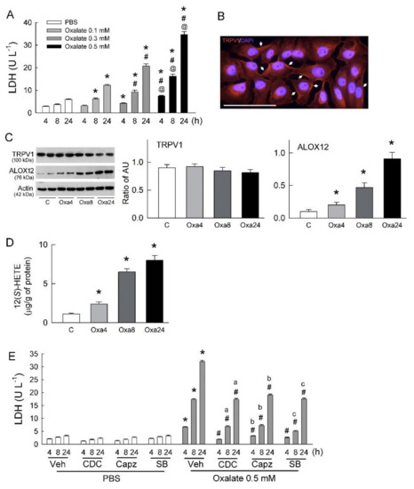 Transient receptor potential vanilloid 1 (TRPV1) inhibition abrogates oxalate-mediated tubular cell injury and increases in cytosolic Ca2+. (A) Release of lactate dehydrogenase (LDH) into culture medium, determined as a marker of cell injury after LLC-PK1 cells treated with various doses of oxalate for 4, 8, and 24 h (n = 6 for each dose and time point). * p < 0.05 vs. PBS-treated group (control) at the same time-point; # p < 0.05 vs. oxalate 0.1 mM group at the same time-point; @ p < 0.05 vs. oxalate 0.3 mM group at the same time-point. One-way ANOVA was applied for statistical comparison. (B) Representative image showing presence of TRPV1 (in red, indicated by arrows) in cells. Cell nuclei were counterstained by 4’,6-diamidino-2-phenylindole (DAPI, blue). White bar indicates scale of 300 μm. (C) Representative blots show TRPV1 and ALOX12 expression (n = 2 per group) in LLC-PK1 cells using 20 μg of total protein in each lane. Right bar graph shows densitometrically quantified results by ratio of TRPV1 or ALOX12 to actin (n = 6 per group). AU, arbitrary unit of band density; C, control cells treated with PBS for 24 h; Oxa4, Oxa8, and Oxa24 are indicated cells treated with 0.5 mM oxalate for 4, 8, and 24 h, respectively. * p < 0.05 vs. control (C) group analyzed by unpaired t-test. (D) Cellular content of 12(S)-HETE in groups. * p < 0.05 versus C group analyzed by unpaired t-test. (E) Release of LDH after cells treated with PBS or 0.5 mM oxalate or in combination with blockers of ALOX12 (CDC) or TRPV1 (Capz and SB) for 4, 8, and 24 h (n = 6 for each group and time point). Veh, 0.1% DMSO as vehicle solution. Note that releases of LDH in the CDC, Capz, and SB plus oxalate groups for 4, 8, and 24 h of cotreatment were all significantly lowered when compared to those in the oxalate-treated group. * p < 0.05, oxalate- vs. PBS-treated group at the same time-point; a p < 0.05, CDC + oxalate group vs. CDC + PBS group at the same time-point; b p < 0.05, Capz + oxalate group vs. Capz + PBS group at the same time-point; c p < 0.05, SB + oxalate group vs. SB + PBS group at the same time-point; # p < 0.05 vs. 0.5 mM oxalate-treated group at the same time-point. One-way ANOVA was applied for statistical comparison.