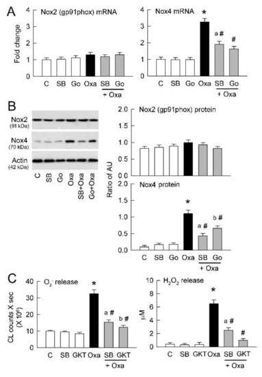 The enzymatic activity of Nox is the major source of intracellular ROS generation, including superoxide and H2O2. We previously showed that oxidative stress caused by excess ROS formation plays an important role in tubular damage in kidney stone patients with hyperoxaluria [23]. The present results confirm tubular cell expression of Nox2 and Nox4 (Figure 3A,B). Interestingly, oxalate increased Nox4 but not Nox2 expression at both the mRNA and protein level. Moreover, inhibition of TRPV1 (SB) and PKC (Gö 6976, Go) significantly attenuated Nox4 upregulation in the oxalate-treated cells (Figure 3A,B), indicating TRPV1-mediated PKCα activation is the underlying mechanism for Nox4 upregulation. We examined whether excess ROS formation is related to increased Nox4 expression in terms of oxidative stress. Oxalate treatment increased the release of superoxide and H2O2 into culture medium (Figure 3C). Inhibition of TRPV1 (SB) and Nox4 (GKT137831, GKT) significantly attenuated the effect of oxalate on ROS generation.