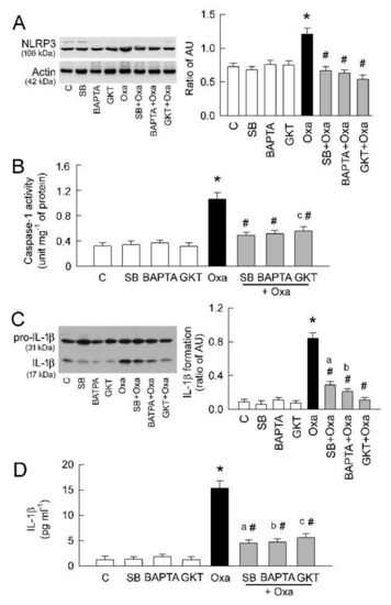 Since inflammation plays a pivotal role in disease progression in oxalate nephrolithiasis [12,24], we then tested whether changes in inflammasome NLRP3 expression could be found in oxalate-treated cells. Our results show that oxalate significantly increased NLRP3 expression, and this could be attenuated by co-treatment with TRPV1 blocker (SB), Ca2+ chelator (BAPTA), and Nox4 inhibitor (GKT) (Figure 4A). This clearly indicates that oxalate-induced Ca2+ overload and oxidative stress are mediators for triggering inflammation in tubular cells.