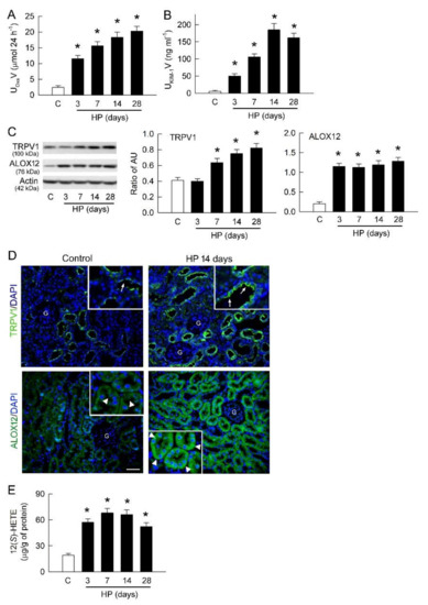 Interestingly, increased renal expression of ALOX12 and TRPV1 was associated with increased renal content of 12(S)-HETE in a time-dependent manner, with a peak increase on the 7th day in HP kidney compared to control kidney (Figure 5E).