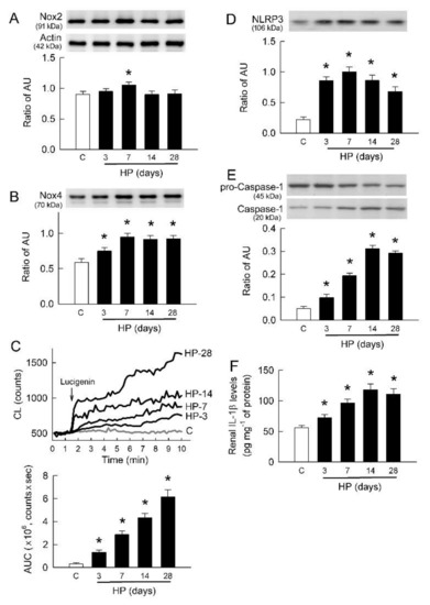 Hyperoxaluria increases Nox4, oxidative stress, and inflammatory mediator expression. (A,B) Representative blots show protein expression of Nox2 (A) and Nox4 (B) (10 μg of total protein per lane) at appropriate molecular weights. Lower bar graphs (n = 6 in each group) show ratio of abritary unit in band density of Nox2 or Nox4 to actin at 6A. (C) Typical tracings show changes in lucigenin-dependent chemiluminescence (CL) counts for superoxide formation in kidney surface of control (C) and 3- to 28-day HP rats. Lower bar graph shows total amount of CL as area under the curve (AUC) for n = 6 in each group and time point. (D) Representative blots show protein expression of NLRP3 (10 μg of total protein per lane). Lower bar graphs (n = 6 per group and time point) show ratio of band density of NLRP3 to actin at 6A. (E) Representative blots show pro-caspase-1 (precursor at 45 kDa) and caspase-1 (at 17 kDa) expression using 10 μg of total protein in each group. Lower bar graph shows densitometrically quantified results by ratio of caspase-1 to pro-caspase-1 to represent caspase-1 activity (n = 6 per group). (F) Quantitative results showing increased tissue content of IL-1β in renal cortex of HP rats (n = 6 per group). * p < 0.05, HP vs. control group analyzed by unpaired t-test.