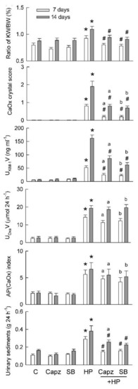 Chronic TRPV1 inhibition abolishes effect of hyperoxaluria on kidney injury and CaOx crystal formation. Basic data were obtained from metabolic cage study and collected over 24 h on day 7 and 14. Both sides of kidneys were collected to calculate percent changes in ratio of kidney to body weight (KW/BW). Deposition of CaOx crystals was examined and scored after staining. Urine was analyzed for KIM-1 (UKIM-1V) and oxalate (UOxaV) excretion. Degree of urinary supersaturation was estimated according to AP(CaOx) index. Precipitated particles in urine were dried to determine weight of urine sediments. N = 6 in each group and time point. Capz and SB are TRPV1 blockers. * p < 0.05, HP vs. control (C) group on the same induction day. a p < 0.05, Capz + HP group vs. HP group on the same induction day; b p < 0.05, SB + HP group vs. HP group at the same induction day; # p < 0.05, blocker-treated vs. untreated HP group on the same induction day. One-way ANOVA was applied for statistical comparison in all graphs.
