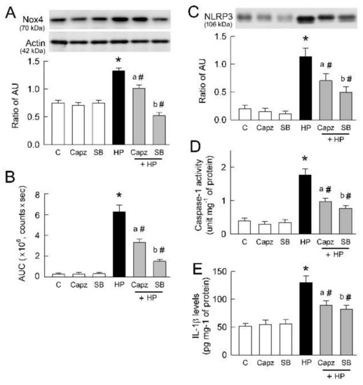 Chronic TRPV1 inhibition attenuates hyperoxaluria-induced oxidative stress and inflammation on day 14. (A) Representative blots show expression of Nox4 using 10 μg of total protein in each group. Lower bar graph shows densitometrically quantified results by ratio of Nox4 to actin (n = 6 per group). (B) Bar graph shows total chemiluminescence (CL) counts for superoxide formation in kidney surface as area under the curve (AUC) for n = 6 in each group. Note that TRPV1 inhibition significantly attenuates oxidative stress in HP kidney. (C) Representative blots show expression of NLRP3 using 10 μg of total protein in each group. Lower bar graph shows densitometrically quantified results by ratio of NLRP3 to actin at 8A (n = 6 per group). (D) Bar graph showing caspase-1 activity measured in tissues of renal cortex in group. (E) Quantitative results showing increased tissue content of IL-1β in group (n = 6 per group). Note that TRPV1 inhibition significantly attenuates renal inflammation caused by hyperoxaluria. * p < 0.05, HP vs. control (C) group. a p < 0.05, Capz + HP group vs. HP group; b p < 0.05, SB + HP group vs. HP group; # p < 0.05, blocker-treated vs. untreated HP group. One-way ANOVA was applied for statistical comparison in all graphs.