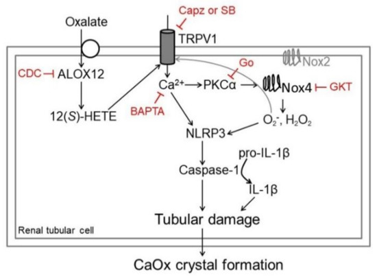 As the schematic diagram in Figure 9 shows, oxalate activates ALOX12 after uptake by tubular cells and enhances endovanilloid 12(S)-HETE formation for TRPV1 activation. Increased [Ca2+]i via TRPV1 induces PKCα activation by increasing PKCα translocation, which subsequently upregulates Nox4 to liberate superoxide and H2O2. Oxidative stress and Ca2+ trigger renal tubular inflammation by increased NLRP3 expression and caspase-1 activation to increase IL-1β formation and release in oxalate-mediated tubular cell injury. TRPV1 hyperfunction in oxalate-mediated nephropathy is further evidenced by in vivo observations showing that chronic TRPV1 inhibition markedly reduced hyperoxaluria-induced tubular damage and CaOx crystal formation via inflammation. However, TRPV1 hyperfunction showed no effect on the degree of hyperoxaluria or urinary supersaturation.