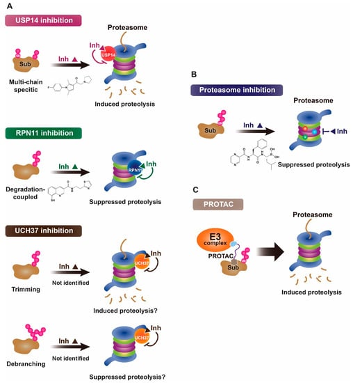 - Shin, J.Y.; Muniyappan, S.; Tran, N.N.; Park, H.; Lee, S.B.; Lee, B.H. Deubiquitination Reactions on the Proteasome for Proteasome Versatility. Int. J. Mol. Sci. 2020, 21, 5312. [Google Scholar] [CrossRef]