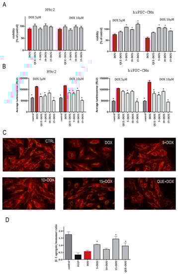 Protective effect of compounds 5, 10, and 15 against doxorubicin-induced cytotoxicity (A), oxidative stress (B), and mitochondrial damage (C,D). The study was performed in two cellular models: H9c2 and hiPSC-CMs. Cells were cultured with tested compounds—5, 10, 15 (25 µM), and quercetin (20 µM)—as a reference standard for 5 h. Then, the medium was removed, cells were incubated with doxorubicin (DOX, 5 or 10 µM) for 90 min, and the MTT (A) or ROS-Glo™ H2O2 (B) assays were performed. Values represent the viability of cells in the percentage of control (untreated cells) ± SEM of six replicates of three independent experiments (A) or average RLU (relative light unit) ± SEM of six replicates of three independent experiments (B). The RLU value increases in direct proportion to the level of oxidative stress generated by the cells. Statistical significance (*) was calculated relative to DOX (p < 0.05). The effect of cinnamic acid derivatives and doxorubicin (CA–DOX) co-treatment on mitochondrial morphology was analyzed via fluorescent photomicrographs representing MitoTracker fluorescent staining of H9c2 cells (C). Bar graph representing JC-1 fluorescent mitochondrial depolarization of H9c2 cells’ membrane potential after CA–DOX treatment. Data are represented as two independent biological experiments, each with four technical replicates (n = 8). Results are expressed as the mean ± SEM (D).