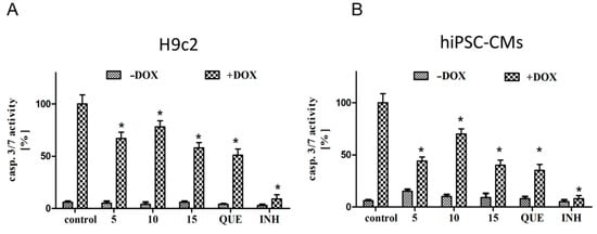 The protective effects of compounds 5, 10, and 15 against doxorubicin-induced apoptosis. (A) represents the results for H9c2 and (B) for hiPSC-CMs. Cells were seeded into 96-well plates; after 24 h, cells were pre-incubated in the presence of the compounds (5, 10, 15, and QUE) for 24 h, and then DOX was added for the next 24 h. Luminescent detection of caspase-3 and -7 was performed according to the manufacturer’s specifications. Caspase-3/7 activation results are expressed as a percentage (mean value for condition × 100/control) ± SEM, n = 9. Statistical significance (*) was calculated relative to control (p < 0.05) separately for DOX (–) and DOX (+) conditions. Cells were incubated with or without the wide-ranging caspase inhibitor (INH) Z-VAD-FMK at a concentration of 20 µM, in order to indicate the caspase-dependent mechanism of apoptosis.