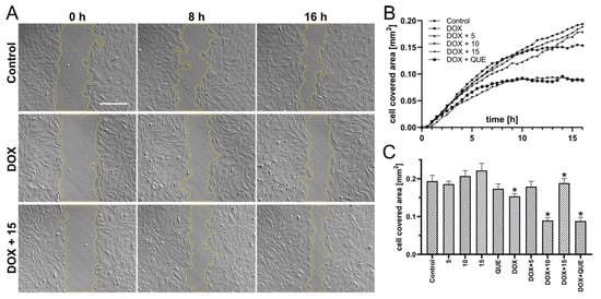 Rat cardiomyocytes were seeded in quantities of 1 × 105 per well in 12-well plates (Falcon, Corning Life Sciences, Tewksbury, MA, USA) and cultivated overnight in order to achieve 100% confluence in the presence of CA derivatives and quercetin (preincubation). Artificial wounds were made manually with a pipette tip, after which the culture medium was replaced with a fresh one containing the desired concentration of DOX. Images were captured with a Leica DMI 6000B fully motorized inverted microscope equipped with modulating contrast, an environmental chamber, and a DFC360 FX CCD camera (Leica, Wetzlar, Germany). Time-lapse imaging was performed under the control of LAS X software (Leica Microsystems, Wetzlar, Germany) every 10 min for 16 h in multiple fields of view. Image analysis was conducted in Fiji distribution of ImageJ software []. The wound area was outlined automatically using MRI Wound Healing Tool, measured and calculated as a difference between a given time step and the initial one. Results were averaged with 30 min time intervals for at least 10 fields of view from 2 separate experiments.