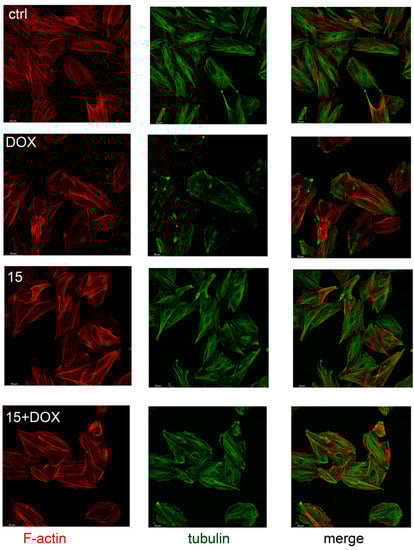 The bidirectional relationship between heart function and cardiomyocytes’ morphology exists, as tissue remodeling and myocardial contractility dysfunction have been shown to be the result of changes in the cytoskeleton []. In addition, the cytoskeleton is also involved in cell migration and myocardial regeneration processes []. In the present study, rat cardiomyocytes were preincubated in the presence of compound 15, and then DOX (0.5 µM) was added for the next 16 h. After incubation, cells were fixed and immunostained with tubulin antibody labeled with Alexa 488, and counterstained with phalloidin labeled with TRITC for cytoskeleton visualization. Our study shows that compound 15 protected cardiomyocytes’ cytoskeletons against DOX damage. DOX used alone induced visible cytoskeleton rearrangement (Figure 4).