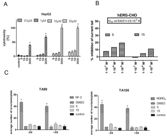Safety assessment of CA derivatives. Hepatotoxicity analysis was conducted on the HepG2 cell line (A). Cells were incubated in the presence of analyzed compounds for 24 h, then the CytoTox-Glo assay was performed. Graph represents the % of cytotoxicity ± SEM of six replicates of three independent experiments. DOX was used as a reference standard. Statistical significance (*) was calculated relative to control (p < 0.05). ADME-Tox cardiotoxicity was investigated using the hERG-CHO cell line in an automated patch clamp assay performed by Eurofines. The degree of inhibition (%) was obtained by measuring the tail current amplitude, which was induced by a 1-s test pulse to –40 mV after a 2-spulse to +20 mV, before and after incubation with the compounds (5, 15) (the difference in current was normalized to control and multiplied by 100 in orderto obtain the percent of inhibition). Compound E4031 was used as a reference standard. The experiment was performed in triplicate (B). Mutagenicity of compounds 5 and 15 in the absence (–S9) or presence (+S9) of the S9 fraction using the Ames test. Graphs represent the average number of revertants/plate of TA98 and TA100 bacteria strains growing after incubation with the compounds ± SEM of nine replicates of three independent experiments. Statistical significance (*) was calculated relative to control using the Mann–Whitney test (p < 0.05). Positive controls used for the MPF protocol were 2-nitrofluorene (2-NF) (TA98, –S9) and 4-nitroquinoline-N-oxide (4-NQO) (TA100, –S9); DMSO was used as the negative control (C).