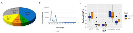 sRNA sequencing was done for 10 normal and 25 TG patients. The libraries with more than 50% of un-annotated reads (possible DNA contamination/degradation) were considered as bad quality libraries and were removed for further analysis. Specifically, the length distribution for mapped reads with no distinct peaks indicating possible RNA degradation are excluded from analysis. 9 control and 21 TG libraries were then considered for differential expression analysis. The data can be found at GSE156874. The details of mapping and differential expression analysis are described below.