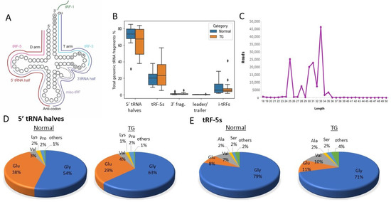 We then explored the specific tRNA origins of the most abundant fragment class: the 5′ tRNA halves. As shown in Figure 2D, more than 90% of 5′ tRNA halves in the serum of transplant patients originated from tRNA-Gly (50–60%) or tRNA-Glu (30–40%). As reported by Godoy et al. [22] the distribution of tRFs to certain tRNAs is similar in healthy individuals’ serum as well. Likewise, tRF-5s mainly originate from tRNA-Gly (~70%) followed by tRNA-Glu (~10%) and tRNA-Val (8–10%) (Figure 2E).