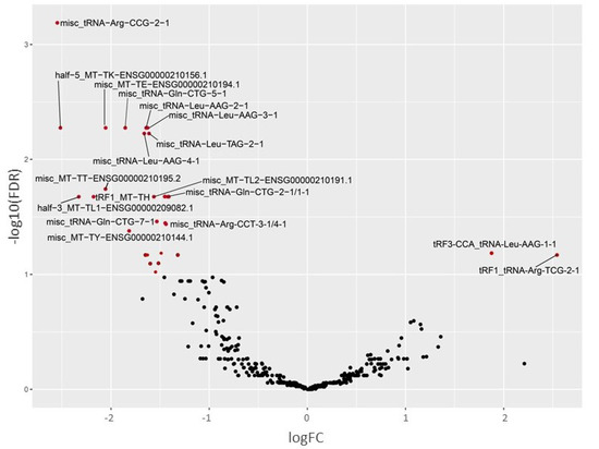 Volcano plot showing the differentially expressed tRNA fragments in TG compared to normal allograft. Significant changes with LFC2 > 1 with FDR < 0.1 are labeled red.