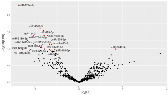 In the studied serum samples, miRNAs were the most abundant category (~30% of sRNA pool) (Figure 2C). Nineteen miRNAs were differentially expressed between TG and control serum samples (FDR ≤ 0.1) (Figure 4, Supplementary Table S3). Interestingly, 18 miRNAs were downregulated in the serum of TG. Some of the significantly differentially expressed miRNAs were found to be related to kidney development or pathology of kidney disease indicating the findings are related to condition [30,31,32,33].