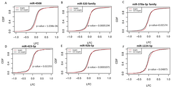 Cumulative distribution plots of mRNAs based on miRNA target status. mRNA targets of downregulated serum miRNAs (miR-4508 (A), miR-320 (B), miR-378a-3p (C), miR432-5p (D), miR-92b-5p (E) and miR-1224-5p (F)) are upregulated in the kidney tissue. mRNA targets of miRNA are predicted using TargetScan based on seed sequence complementarity. Non-targets represent mRNA which do not have complimentary seed match with the miRNA.