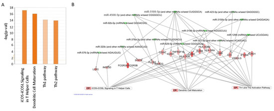 miRNA and mRNA datasets (mRNA available for same set of samples (GSE93659) were also integrated and subjected to network analyses by Ingenuity Pathway Analysis (IPA) to identify plausible associations and potential regulatory networks relating to TG. The top upregulated canonical pathways in TG biopsies included iCos-iCosL signaling pathway in T helper cells (z-score: 3.5), dendritic cell maturation (z-score: 4.025), and Th1 (z-score: 1.667) and Th2 pathways (z-score: 3.317) (Figure 6A). Furthermore, differentially expressed miRNAs and mRNAs were integrated using IPA tools. These analyses showed that downregulated miRNAs in the serum of TG patients are potential upstream regulators of overexpressed genes in the kidney tissues. These up-stream regulators explain the changes leading to activated canonical pathways such as iCOS-iCOSL signaling in T helper cells, dendritic cell maturation and Th1 and Th2 pathways (Figure 6B). It is important to note that our integration was done using experimentally identified differentially expressed miRNAs and mRNAs from TG patients. Furthermore, using a small validation set, we were able to confirm trends of the down-regulation of serum miR-101-3p (p = 0.00768) and miR-320b (p = 0.0612) (Supplementary Figure S3). The expression of these miRNAs and others needs to be further investigated using a larger cohort.