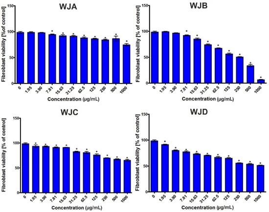 Fibroblast viability (BJ cell line ATTC CRL-2522TM) after a 24-h incubation with the WJA, WJB, WJC, and WJD extracts. * Significantly different results compared to the control (culture medium without extracts—0 μg/mL), unpaired t-test; p < 0.05.