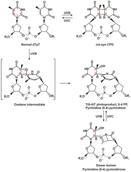 CPDs are the major DNA photoproducts of UV light (Figure 1) [,,,]; 6-4PPs are formed in a 25–30% lower amount than CPDs and are the second most prevalent UV lesion. CPDs only minimally distort the double helix, whereas 6-4PPs produce a pronounced DNA backbone bending and base-pairing disruption. The DNA thermodynamic destabilization ability correlates with repair efficiency of these lesions; CPDs are excised by NER with much slower kinetics as compared to 6-4PPs [,,,].
