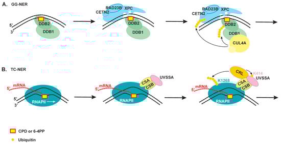 An overview of the damage recognition step of nucleotide excision repair (NER). (A) Global genome NER (GG-NER) can search for damage anywhere in the genome throughout the cell cycle. The UV-DDB protein recognizes CPD or 6-4PP, directly binds to it through its DDB2 subunit, and facilitates efficient recognition of the lesion by the XPC–RAD23B–CETN2 complex. The DDB1 subunit is also a connector protein for ubiquitin ligase CUL4, which ubiquitinates DDB2 and XPC []. (B) Transcription-coupled NER (TC-NER) is responsible for accelerated repair of lesions in the template DNA strand of actively transcribed genes only. The CSB protein and then proteins CSA and UVSSA bind to DNA damage stalled RNAPII. CSB and CSA associate with CRL ubiquitin ligase and contribute to the ubiquitination of the RNAPII RPB1 subunit at K1268. This ubiquitination stimulates the association of TFIIH with the stalled RNAPII through a transfer mechanism that also involves UVSSA-K414 ubiquitination [,].