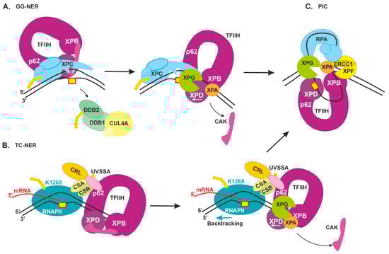 Schematic view of the damage verification step of NER and pre-incision complex formation. (A) GG-NER. TFIIH initially interacts with XPC’s N terminus by means of p62 subunits, then tumbles to XPC’s C terminus, where the interaction with XPB promotes its binding to a duplex part. XPA releases an inhibitory CAK module and together with XPG stimulates XPD activity []. The XPD helicase binds to the damaged strand and starts to a repair bubble formation []. When XPD gets to the lesion and stalls on it, XPC is displaced, and XPG binds to the 3′ edge of the repair bubble. (B) TC-NER. XPC and UVSSA share an interaction surface on the p62 subunit of TFIIH []. RNAPII moves in the 3′→5′ direction on the damaged strand, then, after its lesion stalling and assembly of factors CSB, CSA, and UVSSA, the latter promotes TFIIH binding downstream of RNAPII []. Thereafter, XPA and XPG stimulate XPD activity, and TFIIH starts to move in the 5′→3′ direction and may “push” RNAPII for a backtracking movement. (C) The NER pre-incision complex (PIC): TFIIH stalls on the lesion-bearing strand, RPA covers the undamaged strand, XPA marks the 5′ edge of the repair bubble, XPG marks the 3′ edge of the repair bubble, and XPF–ERCC1 binds behind XPA.