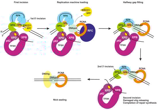 Two endonucleases XPF–ERCC1 and XPG can now incise the lesion-containing DNA strand (Figure 4). The DNA incision is first carried out by XPF–ERCC1 from the 5′ side to the damage site with the formation of a free 3′-OH group []. Next, replication machinery can be loaded to start repair synthesis []. RPA promotes the arrival and positioning of RFC and enhances repair synthesis with possible help of XPA as it interacts with PCNA [,].
