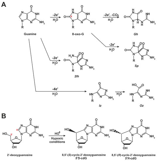 Chemical structures of common oxidative DNA lesions. (A) Guanine oxidation products. Products of two-electron guanine oxidation are 8-oxo-7,8-dehydroguanine (8-oxoG) and 5-carboxamido-5-formamido-2-iminohydantoin (2Ih). Four-electron guanine oxidation products are 5-guanidinohydantoin (Gh), spiroiminodihydantoin (Sp), 2,5-diamino-4H-imidazol-4-one (Iz), and 2,2,4-triamino-5(2H)-oxazolone (Oz). (B) Formation of 8,5′-cyclo-2′-deoxyguanosine (cyclic guanosine, cdG) through hydroxyl radical (HO•) oxidation under hypoxic conditions.
