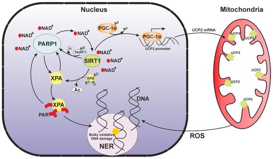 To sum up, in XPA-deficient cells, a lack of NER activity lead to DNA damage accumulation. Under normal conditions, PARP1 activation is needed for cell homeostasis. Massive DNA damage triggers overactivation of PARP1 catalytic activity resulting in NAD+ intracellular depletion and the attenuation of SIRT1 activity. The inhibited SIRT1 cannot deacetylate PGC-1α, and its transcriptional activity stays switched off thus blocking the SIRT1–PGC-1α–UCP2 axis and causing a subsequent mitophagy defect. After that, the mitophagy defect leads to the accumulation of damaged mitochondria content that produce more ROS, which cause more DNA damage and more PARP1 activation and so on until cell death. As mentioned above, this pathological state could be reversed by PARP1 inhibition and restoration of the nuclear–mitochondrial crosstalk (particularly mitophagy) via overexpression of UCP2 and/or supplementation with a NAD+ precursor [] in combination with antioxidant therapy [].