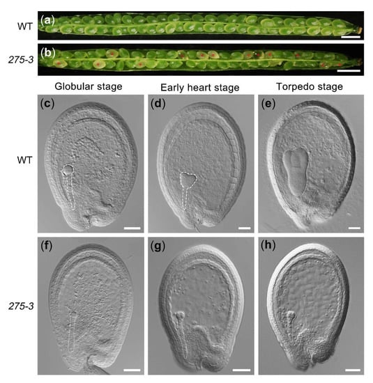 The phenotype of Arabidopsis mutant 275-3. (a) The silique of WT. (b) The silique of Arabidopsis mutant 275-3; the red asterisks indicated the albino ovules. (c–e) The WT ovules at the globular stage (c), early heart stage (d) and the torpedo stage (e). (f–h). The ovules in the mutant 275-3 at which WT ovules were at the globular stage (f), early heart stage (g) and the torpedo stage (h). The bars were 1 mm in (a) and (b), and 50 μm in (c–h).