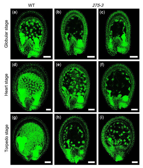 The developmental process of endosperm in Arabidopsis mutant 275-3. (a,d,g) WT ovules. (b,c,e,f,h,i) The ovules in the mutant 275-3. Scale bars = 50 μm.