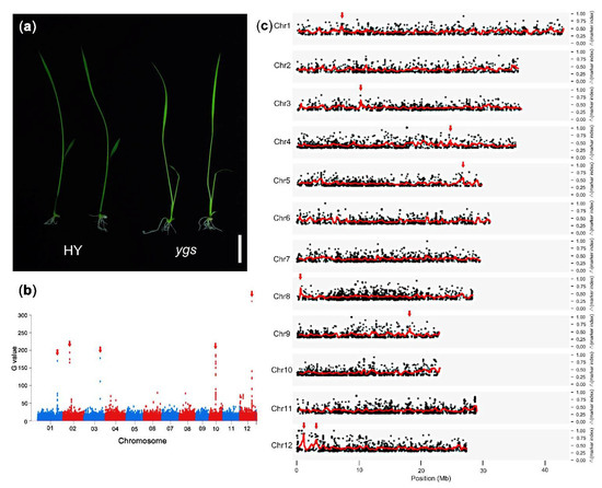 The phenotype of rice mutant ygs and the cloning data using the whole-genome sequencing method. (a) The phenotype of 7DAG seedlings in rice mutant ygs. Bar was 25 mm. (b) The Manhattan plot of the G values. The red arrows indicated the 5 most likely candidate sites. (c) The Δmarker-index plots of the mutant ygs generated by the analysis of MutMap. The red lines represent the sliding window average Δmarker-index values of the 100 Kb interval with 20 kb increments. The red arrows indicated the most likely candidate sites.