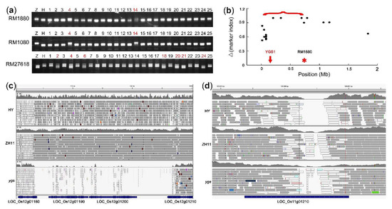 Then, we performed Step Two of the SBM method to sequence the ygs pool mixed with equal DNA of 32 ygs plants and the HY pool mixed with equal DNA of 30 HY plants using the Illumina sequencing platform. The sequencing data of the ygs pool was 40× depth, while the HY pool was 20×. The clean data was screened out and mapped on the rice reference genome and the RGAP 7.0 gene modes (http://rice.plantbiology.msu.edu/pub/data/Eukaryotic_Projects/o_sativa/annotation_dbs/pseudomolecules/version_7.0/; accessed on 7 June 2021). We identified the variants SNP and InDel, and excluded the markers whose supported read numbers were not more than eight. Then, we performed two analysis methods to identify the candidate sites. Firstly, we calculated the G value of SNP and drew the Manhattan plot to identify the phenotype-linked markers (Figure 5b). The top 0.1% sites were considered as the candidates, and 83 possible sites appeared, five of which were the most likely sites (Figure 5b, Table S2). Meanwhile, we calculated the Δmarker indexes of the SNP and InDel markers and analyzed them using MutMap [7]. The average distributions of the Δmarker-index showed that there were eight candidate regions in seven chromosomes with the threshold 0.6 (Figure 5c).