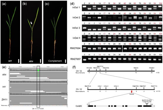 The phenotype of abs and cloning of OsABS gene: (a) 14 DAG seedling of Hwayoung (HY); (b) 14 DAG seedling of abs. The white arrow indicated the chlorotic fourth leaf; (c) 14 DAG complementary seedling of abs. (d) The analysis of recombinants around the mutated site in abs. All the plants used here were the recombinants at RM27618 or RM27715, and the red number indicated the recombinant. InDel 1, InDel 2, InDel 3, InDel 4, RM27694 and RM27697 are located around Chr12: 4,070,394 bp, Chr12: 4,187,138 bp, Chr12: 4,400,174 bp, Chr12: 4,403,614 bp, Chr12: 4,814,750 bp and Chr12: 4,920,770 bp, respectively. Z, Zhonghua 11; H, Hwayoung. (e) The whole-genome sequencing results at the mutated site in abs, HY and ZH11 using the IGV software. A thymine (Chr12: 4,710,533 bp, indicated in the black box) was converted to adenine. (f) The cloning procedure of OsABS. Bars were 2 cm in (a–c).