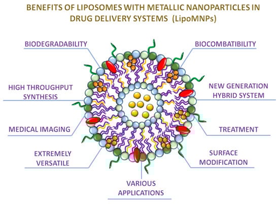 Metal nanocarriers are emerging structures that can enhance the therapeutic activity of many drugs by improved release and targeted potential, however numerous barriers, such as colloidal instability, cellular toxicity, and poor cellular uptake, restrain their applicability in vivo. The nanohybrid systems offer to overcome these limitations and to combine the properties of liposomes and metal nanocarriers for effective theragnostic drug delivery systems [106].