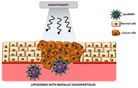 The main interest of scientists is curing cancer due to the numerous difficulties that arise during the treatment process. Conventional treatment of cancer includes surgery, chemotherapy, and radiation therapy. Many different factors are used to sensitize cancer cells to ionizing radiation while protecting the percentage of normal cells in the field of the therapeutic beam [39]. Metallic nanoparticles are usually used as agents sensitizing cancer cells to ionizing radiation during radiotherapy [40]. In combination with liposomes as nanoparticle delivery carriers, it is possible to obtain a high-throughput treatment strategy. Success factors of this type of treatment system should also be taken into account [37]. Radiosensitizers incorporation must not have a destructive effect on the physical and chemical properties of the liposome. Usually, the process of realizing radiosensitizers is undertaken by using different factors. Under the influence of a stimulating factor such as temperature, pH or light energy, liposomes should decompose effectively. Moreover, the stimulus factor should not destroy healthy tissues (Figure 3).