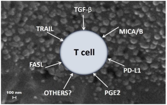 T lymphocytes are not the only immune cells targeted by TEX. Other immune cells, including human NK cells, B cells and monocytes uptake and internalize TEX more effectively than T cells [], and co-incubation with TEX also alters their activities []. TEX which carry MICA and MICB ligands down-regulated expression of the activating receptors, especially NKG2D, in NK cells []. Activation and cytotoxicity of NK cells are in part mediated by transforming growth factor β (TGF-β), which is prominently displayed on TEX as transforming growth factor-latency associated protein (TGF-LAP), the form necessary for TGF-β activation upon binding to integrins, e.g., α6βV, on the surface of recipient cells [,]. TEX, which are known to carry CD39 and CD73 ectonucleotidases are able to make adenosine from ATP [] and can induce suppression of activated B cells, because adenosine can convert activated B cells into regulatory B cells []. TEX have been reported to inhibit normal differentiation of monocytes and to convert monocytes into TGF-β-expressing DCs, which secreted prostaglandin E2 (PGE2) and interfered with the generation of cytolytic T cells [,]. Further, TEX are implicated in skewing the differentiation of myeloid precursor cells directing it toward the development into highly suppressive MDSCs [,]. This function of TEX was dependent on MyD88 signaling in monocytes and the presence of TGF-β and PGE2 in the TEX cargo []. Interestingly, TEX-induced Treg proliferation and increased suppressor functions of proliferating T reg were associated with increased production of adenosine or inhibitory cytokines (TGF-β, IL-10) by Treg co-incubated with TEX []. Thus, TEX carry the machinery to induce production of inhibitory cytokines, adenosine or PGE2 [,], and thereby indirectly influence functions of cells neighboring immunocytes interacting with TEX.
