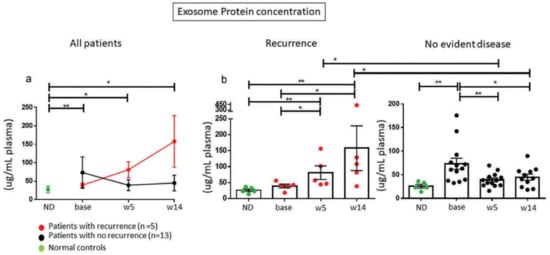Changes in plasma exosomes (shown as total sEV protein level) of HNSCC patients treated with cetuximab/IMRT/ipilimumab. Five patients had recurrence and 13 were NED at 2 yrs. after therapy. Note decreased exosome protein in patients who remained NED for >2 yrs. * p = 0.05; ** p = 0.005. ND= normal donors. Reproduced from ref [].